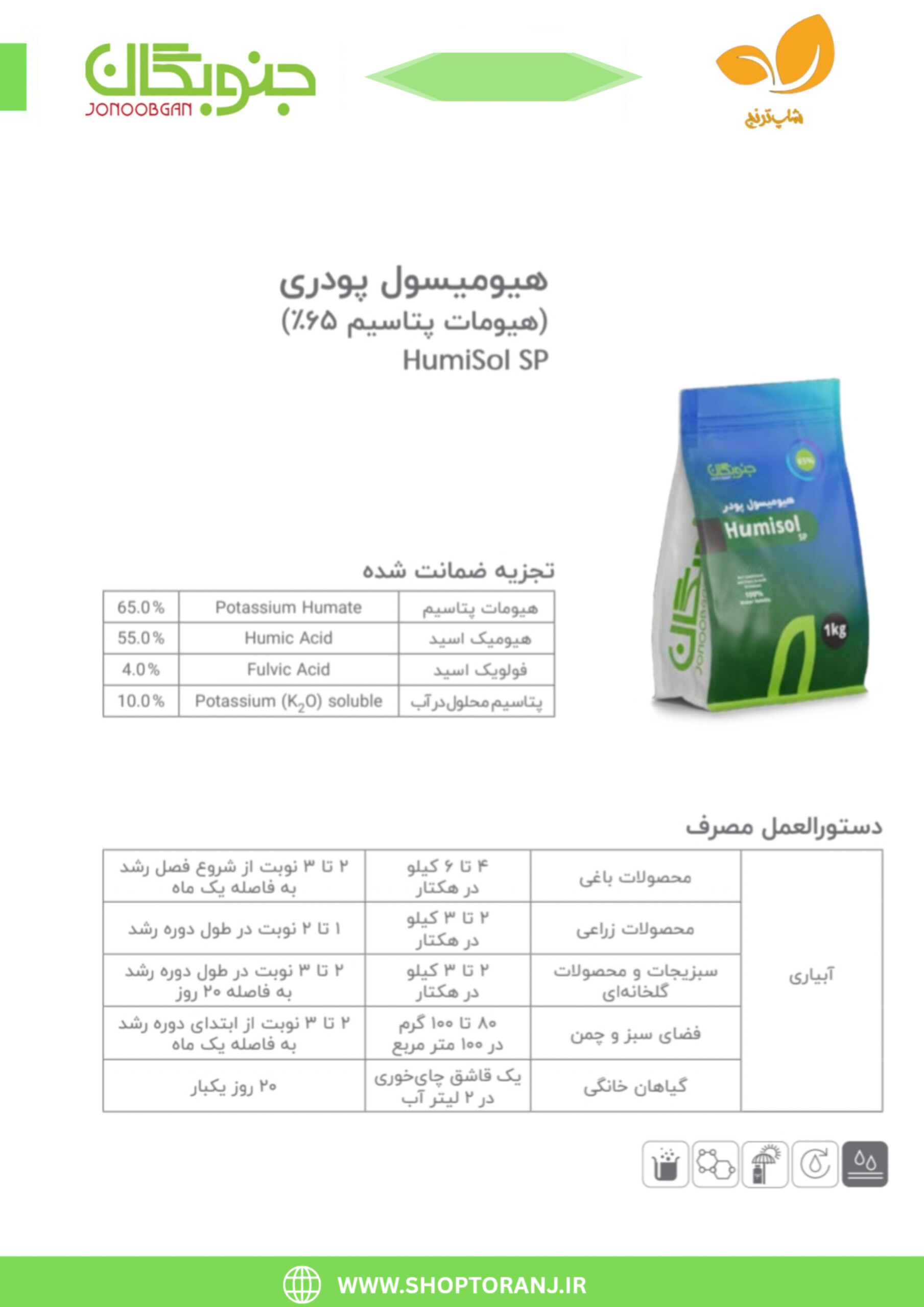 فولویک اسید ۴٪، هیومیک اسید ۵۵٪، پتاسیم ۱۰٪