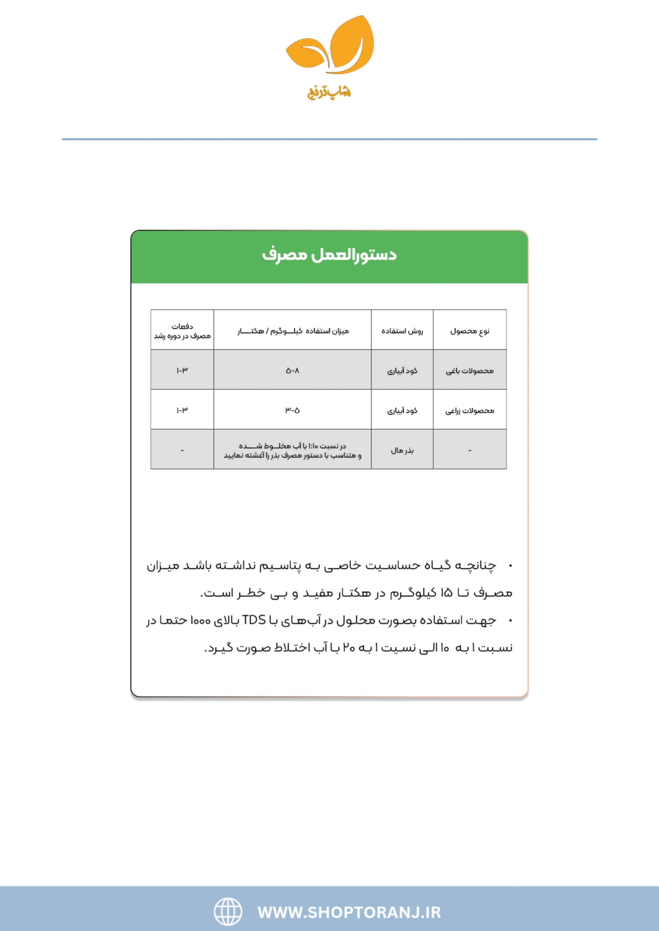 | محصولات باغی | کود آبیاری | ۵-۸ کیلوگرم در هکتار | ۱-۳ |